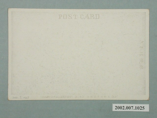 1.本物件為以始政四十周年記念臺灣博覽會,京都館為主題之明信片,正面為京都館黑白照片,畫面中可見京都館,而京都館即為以平安神宮為參考所建,下方有1段文字「(始政四十周年記念臺灣博覽會)第二會場京都館平安神宮模型」,左上有1深紫色圓形戳印,印有建物與樹木圖案,內有由上至下「始政四十周年記念臺灣博覽會」、「昭和十年十月十日至十一月二十八」、「臺北」3段字樣;背面為空白明信片直式書寫面,以黑色單色印刷,左上為郵票黏貼處,上方有「郵便はがき」字樣,左側有「POST CARD」字樣。2.始政四十年紀念臺灣博覽會為西元1935年10月至11月以臺北為主舉辦的博覽會,分為4個會場,第一會場於臺北公會堂附近,第二會場於今二二八公園,第三會場於迪化街附近,第四會場於陽明山,而各地政府也各自舉辦小規模的展覽和活動。京都館位於第二會場,其建築物為以平安神宮作為雛型建造,兩側有蒼龍樓與白虎樓,內為介紹京都之傳統產業,如織物、手工藝等,亦有介紹京都的風景名勝。