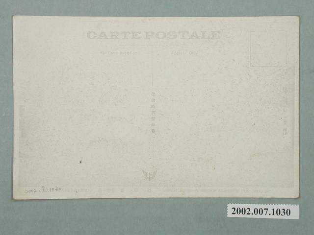 1.本物件為以始政四十周年記念臺灣博覽會,東京館為主題之明信片,正面為東京館黑白照片,畫面中可見其部份建物,主要建物上有「東京館」字樣,其為白色且充滿現代主義感之建築,,其左側建物有「SOUVEHIR OF OSAKA」、「味の素」2段字樣,照片前方有1噴水池,下方有2段文字,第1段「(始政四十周年紀念臺灣博覽會)第一會場東京館」,第2段「THE GRAND SIGHT OF FORMOSA EXHIBITION, TAIHOKU.」,右上有1藍色圓形戳印,但已模糊無法看清;背面為空白明信片橫式書寫面,以黑色單色印刷,右上處為郵票黏貼處,右側有「郵便はかき」字樣,下方有1鳥圖案,上方有「CARTE POSTALE」及2行字樣,由左至右為「For Communication」、「Address Only」,中央有「臺北新高堂發行」字樣。2.始政四十年紀念臺灣博覽會為西元1935年10月至11月以臺北為主舉辦的博覽會,分為4個會場,第一會場於臺北公會堂附近,第二會場於今二二八公園,第三會場於迪化街附近,第四會場於陽明山,而各地政府也各自舉辦小規模的展覽和活動。東京館位於第二會場內,為特設館,分為8個場面,主要為展示東京是境內的各石化工業、紡織業等現代化工業會社之營業狀況,不同於其他日本地方館,並沒有特產的展出與販賣。