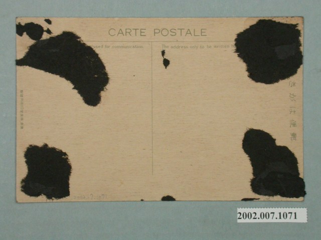 1. 本物件為以第二會場專賣館為主題之明信片,其正面為專賣館黑白照片,影像為1棟上面標有「專賣館」字樣之建築,其建築物中心圓柱形的3至4層式建築,上方建有1座方形塔,影像中央偏又位置有一紫色圓形戳章,上面字樣為「始政四十周年記念台湾博覽會」、「昭和十年自十月十日至十一月二十八日」,影像左上角標註「第二會場專賣館」、「始政四十周年記念臺灣博覽會」。背面為空白明信片橫式書寫面,以黃褐色單色印刷,四角處有黑色的毀損,右側有「郵便はがき」,左側為「廣島精美堂印刷所 謹製」,上方為「CARTE POSTALE」,其下方左側因部分毀損僅可辨識'「used for communication.」,右側部分毀損可辨識為「The address only to be written」。