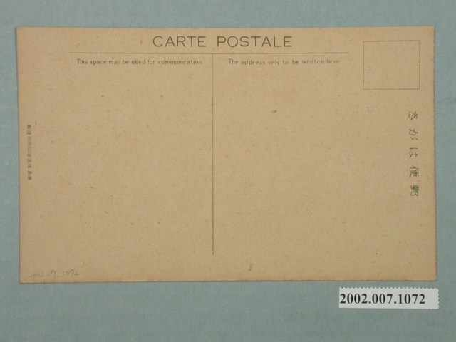 1. 本物件為以國防館為主題之明信片,其正面為國防館黑白照片,影像為以方形為主要設計的展館建築,其中間立有一座方形高塔,並插有日本國旗,右方為國防館門口,上方有「國防館」字樣,門口右側站有1名穿著深色衣服的男性軍人,影像上方偏右位置蓋有紫色圓形圖章,上方有字樣「始政四十周年記念台湾博覽會」、「昭和十年自十月十日至十一月二十八日」、「臺北」,圖樣為南方館建築外觀、棕櫚科植物,以及1個溫泉記號,影像左上角標註「國防館」,右下方「始政四十周年記念臺灣博覽會」。背面為空白明信片橫式書寫面,以黑色單色印刷,右上方為郵票黏貼處,右側有「郵便はがき」,左側有「廣島精美堂印刷所謹製」,上方為「CARTE POSTALE」,其下方左側「This space maybe used for communication」,右側「The address only to be written here」。