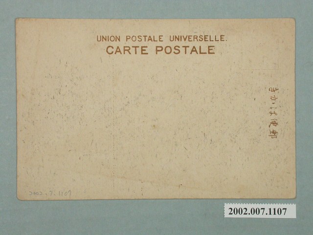 1. 本物件為以大正博覽會第二會場臺灣館為主題之明信片,其正面為臺灣館黑白照片,影像中有數名行人於觀月橋橋面上行走,右方為臺灣館之建築物,為一棟重簷歇山式建築,影像下方標註「大正博覽會第二會場」、「台灣舘」。背面為空白明信片橫式書寫面,以暗紅色單色印刷,右上方框為郵票黏貼處,右側有「郵便はがき」,上方有「UNION POSTALE UNIVERSELLE」、「CARTE POSTALE」,中間偏左位置有一分隔線。2. 西元1914年3月20日至7月31日期間,為了慶祝日本嘉仁天皇登基,於東京上野公園舉行「東京大正博覽會」,臺灣館位於不忍池上的觀月橋旁。日治時期臺灣館於島外的展出,通常以閩南式臺灣家屋或中國式宮殿建築為展覽館造型,展出物品包含臺灣物產展示、風土民情的人偶塑像,對於日本的展出主要為提升國民對新領土臺灣的認識。