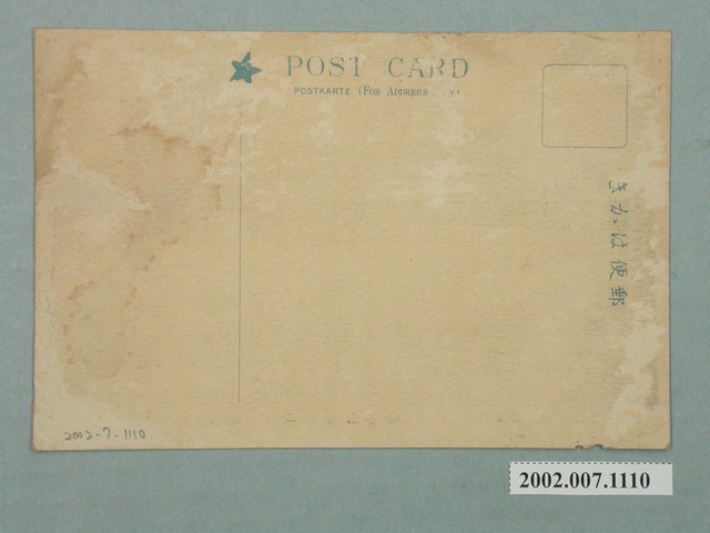 1. 本物件為以東京大正博覽會第二會場臺灣館為主題之明信片,其正面為臺灣館黑白照片,影像中央有1座橋,橋上兩邊皆有路燈,並延伸至1棟重簷歇山式建築,右上方蓋有一紫色圓形戳章,圖樣無法辨識,上方文字為「東京大正博覽會記念」、「3.3.20」意旨日期為大正3年(西元1914年)3月20日,影像下方標註「東京大正博覽會」、「第二會場臺灣館」、「Tokyo Taisho Exhibition」。背面為空白明信片橫式書寫面,以藍綠色單色印刷,右上方框為郵票黏貼處,右側有「郵便はがき」、上方有一星形圖樣,並標示「POST CARD」、「POSTKARTE (FOR ADDRESS)」,中偏左位置有一條分隔線。2. 西元1914年3月20日至7月31日期間,為了慶祝日本嘉仁天皇登基,於東京上野公園舉行「東京大正博覽會」,臺灣館位於不忍池上的觀月橋旁。日治時期臺灣館於島外的展出,通常以閩南式臺灣家屋或中國式宮殿建築為展覽館造型,展出物品包含臺灣物產展示、風土民情的人偶塑像,對於日本的展出主要為提升國民對新領土臺灣的認識。