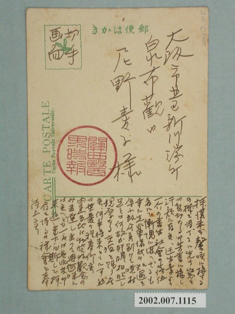 1. 本物件為以第十回關西府縣聯合共進會臺灣館為主題之明信片,其正面有2張黑白照片,右方為臺灣館夜景,以燈泡裝飾的臺灣館在夜晚中亦能展現其建築輪廓,下為水面上的建築物倒影;左方為白天的照片,近景為一棟搭建於水面上的涼亭,橋上有3名人影,遠方為臺灣館,其周邊有4支旗桿,右方兩支旗桿上掛有旗幟,左方旗桿的右方有1棟具有燕尾屋頂的建築,影像上方有以黑筆書寫祈願友人健康文字;明信片右上方貼有一枚藍色郵票,上方文字為「壹錢五厘」,其上蓋有黑色圓型郵戳,並寫有「名古屋」、「4.7.13」;左下角蓋有一紅色人形戳章,上方文字為「曲水迂人」,明信片下方文字由右至左「第十回關西府縣聯合共進會」、「 台灣館」、「 (ショシ-子ヨルィ)」。背面為明信片直式書寫面,以綠色單色印刷,左上角方框中有一綠色蜜蜂圖樣,並寫有「切手画面」,上方有「郵便はがき」,左方有「CARTE POSTALE」、「Union Postale Universelle.」,分隔線上方寫有收件者地址「大阪市」與姓名「尼野麥子」,並蓋有一紅色圓形戳章,其文字以隸書篆刻可能為「關西醫累曉報」,分隔線下方為書寫之內容。2. 第十回關西府縣聯合共進會舉辦期間為明治43年(西元1910年)3月16日至6月13日,其會場位於名古屋。日治時期臺灣館於島外的展出,通常以閩南式臺灣家屋或中國式宮殿建築為展覽館造型,展出物品包含臺灣物產展示、風土民情的人偶塑像等,在日本的展出目的主要為提升國民對新領土臺灣的認識。