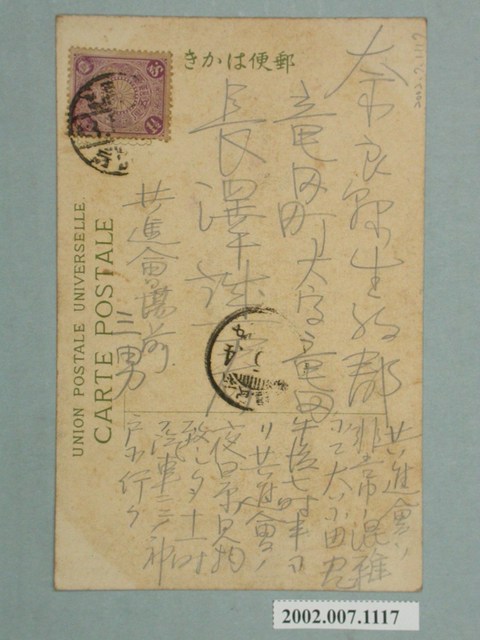 1. 本物件為以名古屋關西府縣聯合共進會臺灣館為主題之明信片,其正面為臺灣館黑白照片,影像中為臺灣館建築物,為一棟中式建築物,其周邊立有5支旗桿,上方綁有三角旗幟,左上方蓋有一紫色、翅膀造型的戳章,其上方字樣其圖樣皆模糊,可辨識下方字樣為「43.3.16」(意旨為明治43年3月16日),「THECOMPETMNEEXHIBITION??NAGOKA」,影像下方標註「名古屋」、「關西府縣聯合共進會」、「台灣舘」。背面為明信片直式書寫面,以綠色單色印刷,左上方貼有紫色郵票,並蓋有黑色郵戳,上方有「郵便はがき」,左方有「UNION POSTALE UNIVERSELLE.」、「CARTE POSTALE」,中間偏下位置有一分隔線,其上方寫有收件者地址「奈良」及姓名「長澤」,以及寄件者標註「共進會場前」、「三男」,並蓋有黑色郵戳,下方寫有信件內容。2. 第十回關西府縣聯合共進會舉辦期間為明治43年(西元1910年)3月16日至6月13日,其會場位於名古屋。日治時期臺灣館於島外的展出,通常以閩南式臺灣家屋或中國式宮殿建築為展覽館造型,展出物品包含臺灣物產展示、風土民情的人偶塑像等,在日本的展出目的主要為提升國民對新領土臺灣的認識。