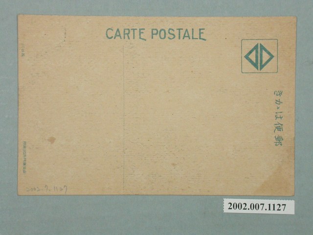1. 本物件為以臺灣勸業共進會夜景為主題之明信片,其正面為南洋館黑白照片,影像拍攝時間為夜晚,由燈泡裝飾南洋館外觀,使其在夜晚仍清晰可見,中央圓拱入口處及兩側塔樓式建築佈滿燈飾,下方標註「台灣勸業共進會イルミネーション」。背面為空白明信片直式書寫面,以藍綠色單色印刷,左上方框中有以兩個等腰三角形拼成的菱形圖樣,上方有「郵便はがき」,下方寫有「台北南門外印刷所」、「長谷川」,左側有「CARTE POSTALE」。2. 臺灣總督府為慶祝始政20週年,於西元1916年4月10日至5月15日(從原定日期延期6天)在臺北舉行首場大型展覽活動,其目的為藉此展示日本於臺灣殖民二十週年的成果。南支南洋館以暹羅、印度建築風格為主,其展覽品依據地域範圍分為中國、南洋等區域。