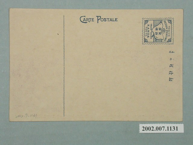 1. 本物件為以臺灣勸業共進會第二會場機械館為主題之明信片,其正面為機械館黑白照片,影像色調偏紫,建築物前方道路上有一人影,道路兩旁設有路燈,機械館入口處為圓拱形,入口兩側有兩座圓形屋頂的塔樓,兩旁為兩層樓建築物,下方標註「臺灣勸業共進會」、「第二會場演藝館」,「演藝」兩字使用黑筆畫有兩橫線,並寫有「キカイ」,「TAIWAN EXHIBITION, FORMOSA」、「(新高堂發行)」。背面為空白明信片直式書寫面,以藍色單色印刷,左上方方框中,由上至下分別寫有「TOKYO」、「DESIGN PRINTING」、「TRADE MARK」、「KANDA TOKYO」,中央有一寫有「登錄商標」4字的鳥形圖案;方框右側有「郵便はがき」,明信片左側標有「CARTE POSTALE」,中央偏下位置有分隔線。2. 臺灣總督府為慶祝始政20週年,於西元1916年4月10日至5月15日(從原定日期延期6天)在臺北舉行首場大型展覽活動,其目的為藉此展示日本於臺灣殖民二十週年的成果。機械館外觀以幾何造型設計為主,由日本及臺北各會社聯合展,展示品包含發電機、染織機械、工廠模型等。