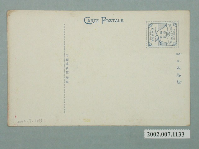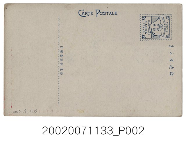 1. 本物件為以臺灣勸業共進會第二會場機械館為主題之明信片,其正面為機械館彩色照片,影像道路兩旁裝設有路燈,並有1人行走在道路偏左位置處,機械館為1棟左右對稱建築,中央以方形為主體,其上方兩側各插有一紅色旗幟,入口為圓拱狀,兩旁各有1座半圓型屋頂的塔樓,左右兩旁為藍色屋頂的兩層樓建築,影像下方標註「臺灣勸業共進會第二會場機械館」、「THE TAIWAN EXHIBITION, FORMOSA.」。背面為空白明信片直式書寫面,以藍色單色印刷,左上方方框中,由上至下分別寫有「TOKYO」、「DESIGN PRINTING」、「TRADE MARK」、「KANDA TOKYO」,中央有一寫有「登錄商標」4字的鳥形圖案;方框右側有「郵便はがき」,明信片左側標有「CARTE POSTALE」,中央偏下位置有分隔線,其上方寫有「臺北新高堂發行」。2. 臺灣總督府為慶祝始政20週年,於西元1916年4月10日至5月15日(從原定日期延期6天)在臺北舉行首場大型展覽活動,其目的為藉此展示日本於臺灣殖民二十週年的成果。機械館外觀以幾何造型設計為主,由日本及臺北各會社聯合展,展示品包含發電機、染織機械、工廠模型等。