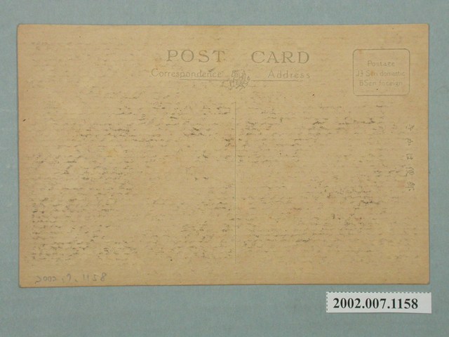 1. 本物件為以產業與觀光的大博覽會第一會場臺灣館為主題之明信片,其正面為臺灣館黑白照片,影像中有一棟城門建築,下方圓拱形入口處有一方牌子,寫有「臺灣館」,右上方蓋有一藍色圓形戳章,上方文字為「產業と觀光の大博覽會」、右方「會期」、「昭和七年自四月十二日至六月五日」,影像下方標註「產業と觀光の大博覽會」、「 第一會場」、「台灣館」。背面為空白明信片橫式書寫面,以黑色單色印刷,右上角方框中印有「Postage 1½ Sen domestic 6 Sen foreign.」,右側標註「郵便はがき」,上方為「POST CARD」,其下方有一飛馬圖樣,圖樣兩側左側為「Correspondence」,右側為「Address」。2. 產業與觀光的大博覽會於昭和7年(西元1932年)4月12日舉辦,會期至6月5日。日治時期臺灣館於島外的展出,通常以閩南式臺灣家屋或中國式宮殿建築為展覽館造型,展出物品包含臺灣物產展示、風土民情的人偶塑像等,在日本的展出目的主要為提升國民對新領土臺灣的認識。