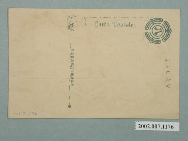 1. 本物件為以臺灣館為主題之明信片,其正面有兩張黑白照片,右上方框中有一棟中式左右對稱建築物,其兩側各有一座塔樓建築,左側塔樓周邊圍有竹製鷹架,下方標註「臺灣館」,可能為明治43年(西元1910年)第十回關西府縣聯合共進會臺灣館影像,右下紅色方框中有一疑似為涼亭的建築物,其屋頂為類似圓形,入口處有階梯。背面為空白明信片橫式書寫面,以藍綠色單色印刷,右上方有一圓形圖樣中間有疑似中文字「八」字樣,右側有「郵便はがき」,上方偏右有「Carte Postale」,中央分隔線上方有一名古屋城金鯱圖樣,分隔線右側有「東京神田今川橋青雲堂製」。