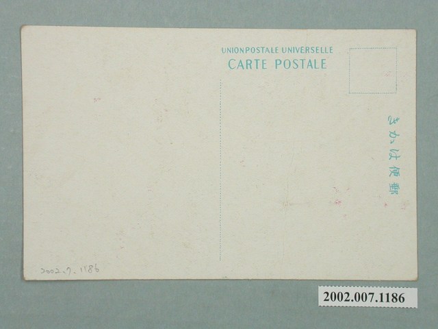 1. 本物件為以臺灣博覽會正門為主題之明信片,其正面為臺灣博覽會正門彩色照片,影像中央為牌坊式的的樓門,以綠色為屋頂及屋簷的顏色,柱子以紅色為主,一樓處掛有12顆紅色燈籠,左方有數名穿著日式和服的行人,中央竹製圍欄中,有疑似棕櫚科植物,影像下方標註「入口臺灣古式建築樓門」、「(臺灣博覽會發行)」。背面為空白明信片橫式書寫面,以藍色單色印刷,右上方框為郵票黏貼處,右側有「郵便はがき」,上方有「UNION POSTALE UNIVERSELLE」、「CARTE POSTALE」,中間有一虛線分隔線。2. 日治時期所舉行的「臺灣博覽會」,以現存紀錄主要有3個:(1)西元1929年東京兩國國技館的「臺灣博覽會」、(2)西元1930年8月在大阪高島屋舉辦的「臺灣博覽會」、(3)西元1935年10月在臺灣本島舉行的「始政40年臺灣博覽會」,而此門無法判定為何年臺灣博覽會之門。