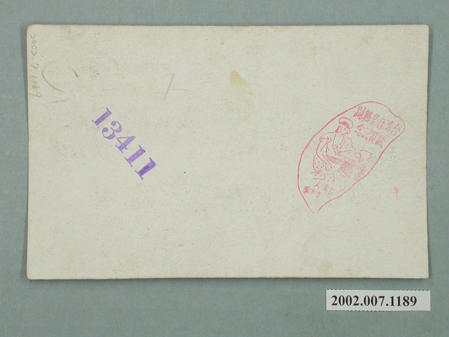 1. 本物件為以著原住民傳統服飾的女人為主題之明信片,其正面為穿著原住民服飾女性黑白照片,影像中為一位穿著原住民服飾的女性,其雙手拿持、口中啣著的應是口簧琴樂器,下方以蓋有紫色的數字「13308」。背面為空白明信片橫式書寫面,右邊蓋有一紅色,形似臺灣的戳章,其中寫有「台湾音楽舞踊觀覽記念」、「台湾人音楽團」,中間圖樣為一位戴著帽子的女性,其身旁有一個籃子,左邊則以紫色戳章蓋有「13411」。2. 口簧琴為彈撥樂器,是臺灣原住民族群,除了蘭嶼的達悟族之外普遍均有的樂器,製作方式為將竹片中間切空,鑲入銅片或切割竹片時,留置中間細長的竹片將其削薄,在兩邊固定繫繩後,以口為共鳴箱,右手發繩、左手固定以發出聲音。