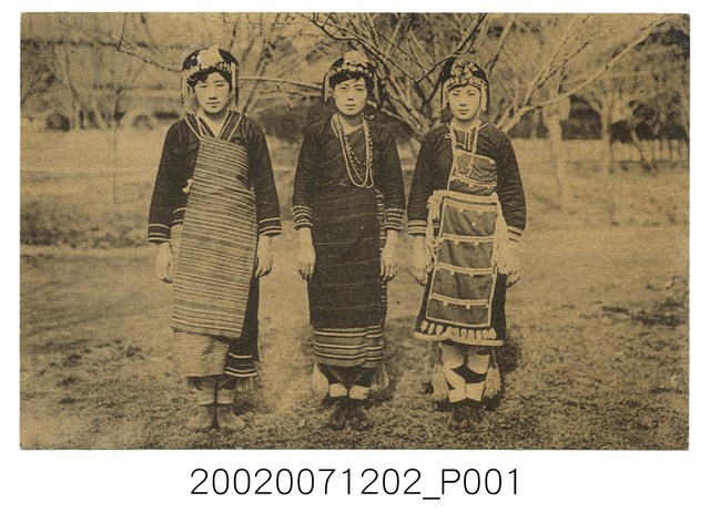 1. 本物件為以3名穿原住民服飾之少女合照為主題之明信片,正面為3名少女黑白照片,影像中有3名頭上戴有花朵裝飾的帽子的女性,其上身皆為長袖上衣,由右至左的披肩分別為方格紋路、深色橫紋樣式以及橫紋樣式的披肩,並皆穿著布裙,小腿處有綁腿,應皆為赤腳站立於草地上,右側的女性腰際處可觀察到其繫有繩子狀的腰帶。2. 西元1923年裕仁皇太子行啟臺灣時,賜名「高砂族」於臺灣山區原住民,此後臺灣原住民成為日本人強調、宣傳臺灣特色的主題之一。在西元1912年大正之前的原住民影像部分,包含主要是對原住民容貌、服飾、工藝特色的紀錄,進入大正之後的原民影像,脫離了人類學的記錄形式,其形象轉變為動態的展示,如:機織、舞蹈等。
