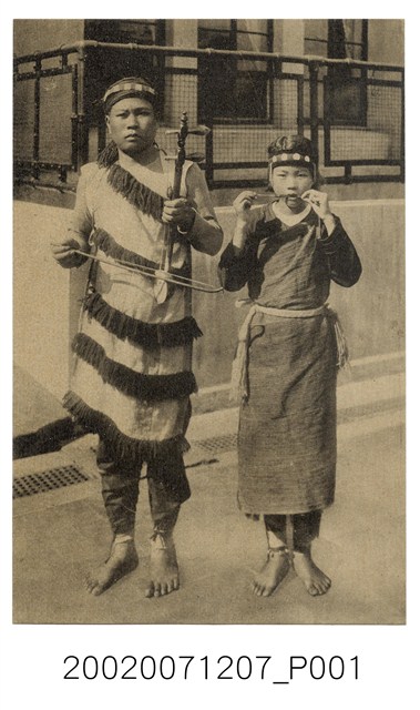 1. 本物件為以男女各1名穿原住民服飾並持樂器合影為主題之明信片,正面為1男1女的原住民黑白照片,色調有些偏黃,影像中有2名原住民,右邊為1名女性,其頭上綁有圓形圖樣的頭帶,上身為長袖深色上衣,並披有長度至小腿以下的披肩,腰際處繫有繩子,小腿處有綁腿,其雙手拿持口簧琴於嘴邊,左邊為1名男性,其頭上綁有圓形圖樣的頭帶,上身披有長度至膝蓋的披肩,小腿處有綁腿,左手拿著疑似胡琴的樂器,右手拿著琴弦,兩人皆為赤腳,後方為1棟建築物。2. 口簧琴為彈撥樂器,是臺灣原住民族群,除了蘭嶼的達悟族之外普遍均有的樂器,製作方式為將竹片中間切空,鑲入銅片或切割竹片時,留置中間細長的竹片將其削薄,在兩邊固定繫繩後,以口為共鳴箱,右手發繩、左手固定以發出聲音,根據日治時期黑澤隆朝的調查,原住民在受到漢人的影響下,亦有使用胡琴之樂器紀錄存在。