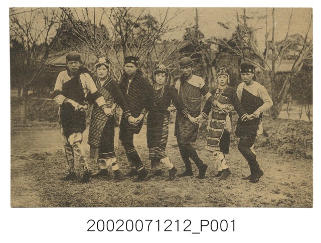 1. 本物件為以4男3女穿原住民服飾並跳傳統舞蹈為主題之明信片,正面為7名男女黑白照片,右側第1名男性頭上有頭帶,身上圍有披肩、第2名及第4名男性皆為頭上帶著圓形帽子,身上圍著披肩,小腿處有綁腿,第3名男性頭上有頭帶,上身穿著橫紋的長袖上衣,小腿處有綁腿;第1名女性及第3名女性的裝扮皆為頭上戴有用花朵裝飾的帽子,身上圍著長度至膝蓋或小腿的披肩,小腿處有綁腿,第2名女性之裝扮為頭上戴有用花朵裝飾的帽子,脖子上帶有數條珠串,身上圍著長度至膝蓋或小腿的披肩,小腿處有綁腿,7人後方有數棟屋舍建築。2. 西元1923年裕仁皇太子行啟臺灣時,賜名「高砂族」於臺灣山區原住民,此後臺灣原住民成為日本人強調、宣傳臺灣特色的主題之一。在西元1912年大正之前的原住民影像部分,包含主要是對原住民容貌、服飾、工藝特色的紀錄,進入大正之後的原民影像,脫離了人類學的記錄形式,其形象轉變為動態的展示,如:機織、舞蹈等。