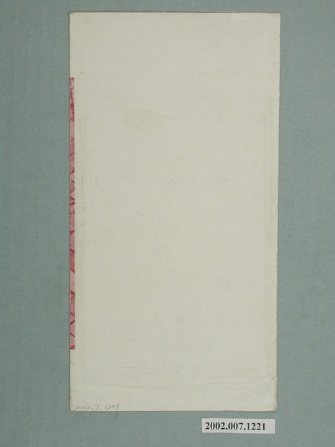 1. 本物件為以臺灣素描為主題的明信片封套,中間為紅色調照片,影像中有兩名女士走在磚道上,左方寫有「台湾スケッチ」,影像下方右側有一紅色圓圈,內寫有「榮」字,旁邊有「菊元」二字。明信片封套背面沒有任何印刷字樣。2. 西元1922年臺北市街名改為町名,衡陽路沿線區域改為「榮町」;菊元百貨於1932年完工,為一棟七層樓建築,其內建有電梯,是當時日治時期最高的民間建築。