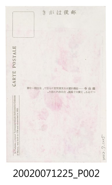 2.矢崎千代二(1872-1947)與石川欽一郎為同一輩畫家,擅長以粉彩速寫,捕捉旅行所見,昭和12(1937)年曾於臺北鐵道飯店舉辦過粉彩畫展,展出從北到南的臺灣名景,其中「日本旅行協會臺灣支部」精選其部分畫作,發行風景明信片。此張明信片描繪臺北市艋舺龍山寺香客絡繹不絕,香火鼎盛的盛況。