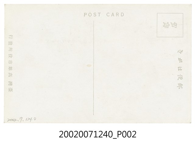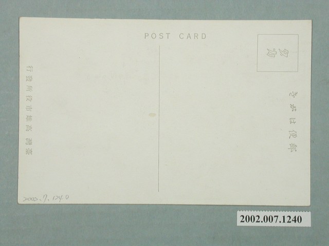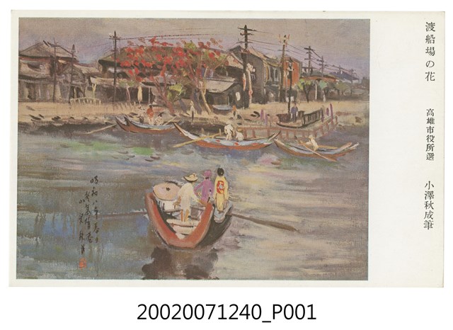 1.小澤秋成於昭和8(1933)年繪畫、高雄市役所發行、彩色印刷之手繪風景明信片,為「高雄紹介」風景繪葉書系列之一。右有說明文字:「渡船場の花、高雄市役所選、小澤秋成筆」,畫由小澤秋成落款「昭和八年春日?高雄港」等字。背面則印刷有「POST CARD、郵便はがき、臺灣高雄市役所發行」等字。