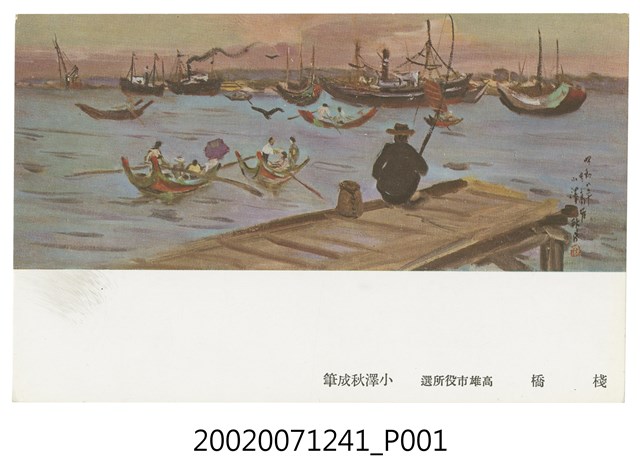1.小澤秋成於昭和8(1933)年繪畫、高雄市役所發行、彩色印刷之手繪風景明信片,為「高雄紹介」風景繪葉書系列之一。下有說明文字:「棧橋、高雄市役所選、小澤秋成筆」,畫由小澤秋成落款「昭和八年於高雄小澤秋成」等字。背面則印刷有「POST CARD、郵便はがき、臺灣高雄市役所發行」等字。