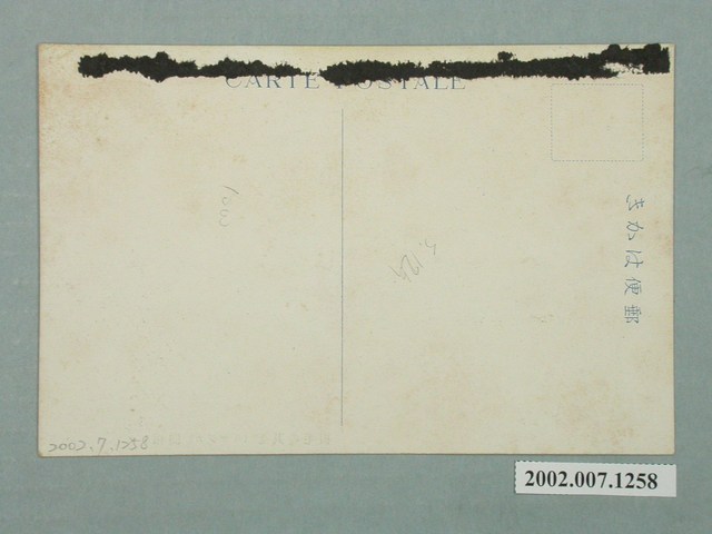 1. 本物件為以榕樹為主題之明信片,其正面為榕樹彩色繪圖,圖畫中有7個人影,以印象主義的風格進行榕樹的鬚根及樹幹繪畫,右下方標註:「榕樹(ガジマル)と其の毛根」。背面為空白明信片橫式書寫面,以深藍色單色印刷,右上方框為郵票黏貼處,右側有「郵便はがき」,上方有黑色毀損痕跡,其字樣應為「CARTE POSTALE」,中間有一道分隔線。2. 榕樹為臺灣原有物種,分布於全臺低海拔山區及平地,全臺有數種品種,亦有臺灣特有種,而榕樹耐旱耐貧瘠,常被作為庭園植物或行道樹所栽種,而傳統信仰中,榕樹聚陰,能驅邪煞,而又因其諧音,被作為「有容乃大」之意,因此廟宇前常會種植榕樹。