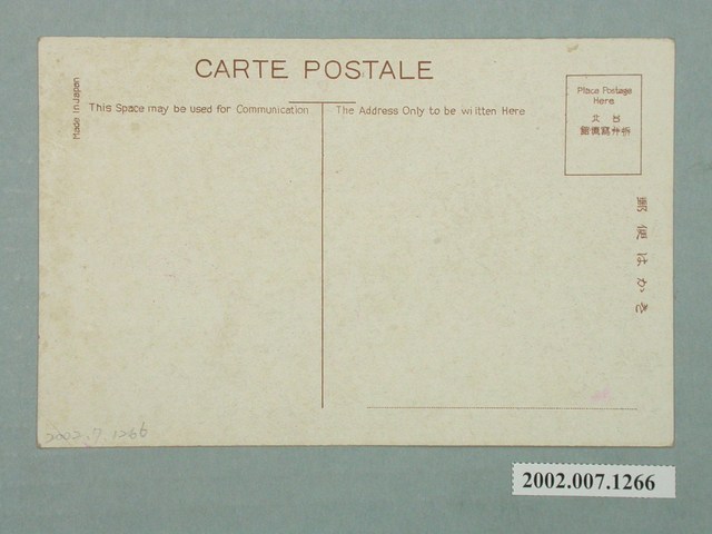 本物件為以景色為題之明信片,其正面為1張黑白照片,影像左方有一座半身人像,其後種有許多植物,正面沒有任何文字標示。背面為空白明信片橫式書寫面,以咖啡色單色印刷,右上方框內寫有「Place Postage Here」、「台北折井寫真館」,右側為「郵便はがき」,右側底下有一條虛線,左上角有「Made in Japan」,上方有「CARTE POSTALE」,其下方兩側左「This Space may be used for Communication」,右「The Address Only to be written Here」,中間有一條分隔線。