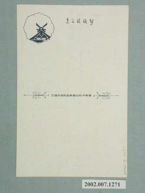 1. 本物品為以臺南故北白川宮殿下御遺跡所御寢臺為主題之明信片,其正面為兩張黑白照片,影像右上方為御遺跡所黑白照片,影像中為一棟單層樓式平房,下方標註「臺南故北白川宮殿下御遺跡所」,左方為寢臺黑白照片,影像中物品應為床舖,上方標註「御寢臺」,明信片左上位置有菊花形的紅色戳章,以隸書刻印「官幣中社」、「臺南神社」、「參拜」、「記念」。背面為空白明信片直式書寫面,以深綠色單色印刷,左上有一花形框,內有神社屋頂的圖樣,上方有「郵便はがき」、中間有一分隔線上側「官幣中社台南神社社務所發行」。2. 北白川宮能久親王於西元1895年1月任近衛師團長,馬關條約後率日軍自鹽寮登陸,至同年10月21日攻抵臺南府城,宣布「全臺底定」後,於10月28日病逝,其曾經到過的地點皆被稱為「御遺跡地」。3.臺南神社曾為北白川宮能久親王臺南御遺跡所,即1895年親王南下平定亂事時於臺南居住之所,本為當地豪族吳汝祥宅邸,親王過世後,將其使用過之房間、器物進行保存,1901年竣工。後於1920年起建神社,社殿以阿里山之檜木建造,主要祭祀北白川宮能久親王,1923年竣工,1925年被列為官幣中社,現已拆除,原址現為忠義國小及臺南市美術館二館。