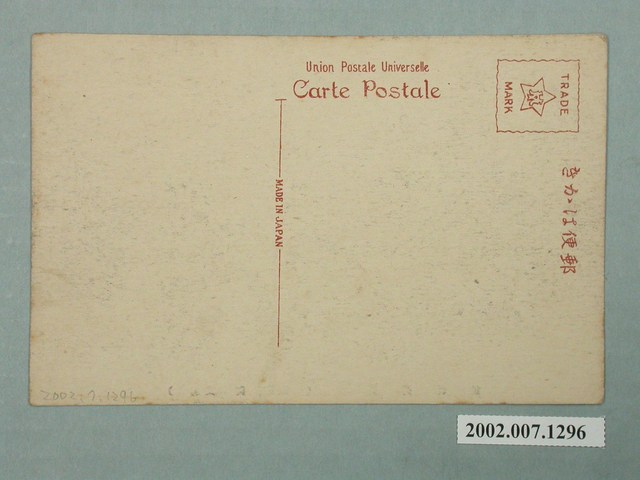 2.正面影像黑白、滿版印刷,下方印有藍色文字「(東宮殿下御渡臺紀念)、臺灣神社」,上蓋有「攝政宮殿下、大正十二年四月臺灣行啓、記念」字樣之戳印。背面則印有紅色文字「郵便はかき、Union Postale Universelle、Carte Postale、MADE IN JAPAN」,郵票黏貼方框有「TRADE MARK」與星星的組合商標。