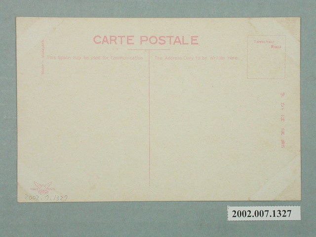 2.正面影像黑白、四周留白邊,印有文字「臺灣所見」、「臺北臺灣神社、明治二十八年臺灣御出征中風土の御病を得させられ、遂に薨去せられた北白川宮能久親王殿下并に外三神を祀り、官幣大社である。社殿は江流に臨み翠巒を負ひ森嚴の感が深い。」等字。背面印刷有粉紅色文字「郵便はがき、CARTE POSTALE、Made in Wakayama」等字,左下角有「TAISHO」信鴿商標圖案,郵票張貼處印有「Taisho Hato Brand」等字。