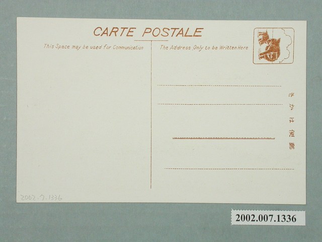 1.臺灣神社社務所發行之「官幣大社臺灣神社繪葉書」系列明信片之一,影像內容為臺灣神社的拜殿、中門、本殿。 2.正面影像黑白、四周留白邊,下方印有文字「官幣大社臺灣神社 拜殿.中門.本殿」。背面則印有棕紅色文字「郵便はかき、CARTE POSTALE」,郵票黏貼方框內有母熊帶小熊的商標圖案。