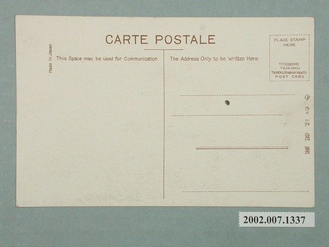 2.正面影像黑白、四周留白邊,下方印有文字「北白川宮大妃殿下御手植內地松」。背面則印有棕色文字「郵便はかき、CARTE POSTALE、Made in Japan」,郵票黏貼方框內有「PLACE STAMP HERE、TITOSeCHO TAIHOKU、TAIHOKUSYASHIN INSATU、POST CARD」等字。