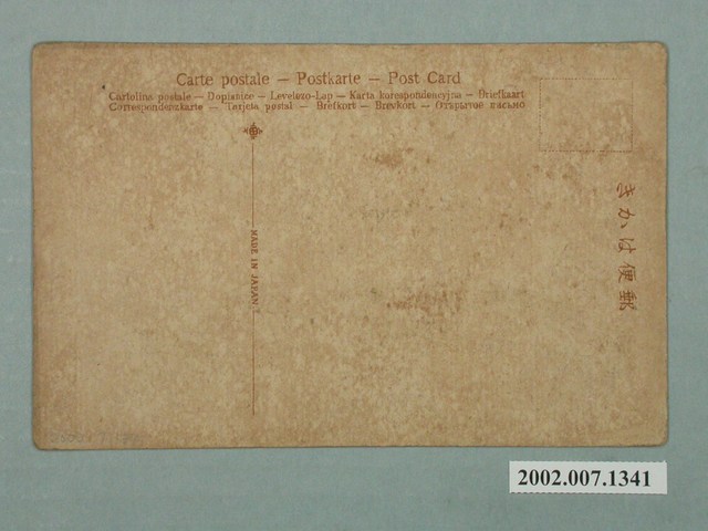2.正面影像全幅,四周加框線,下方印有文字「神社全景」,中央下方蓋有「官幣大社臺灣神社參拜記念」字樣戳印,戳印圖案中央為臺灣總督府的上下二個等腰三角形組合而成的「台」字標誌。背面則印有紅色文字「郵便はかき、Carte Postale-Postkarte-Post Card、MADE IN JAPAN」」,以及「上田」組合字之商標圖案。