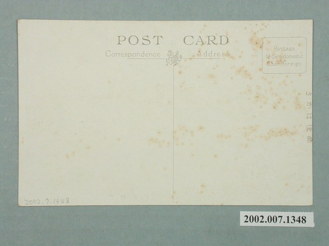 1. 本物件為以建功神社神苑為主題之明信片,其正面為建功神社彩色照片,影像兩側各有一排石燈籠,並種有棕櫚科植物,影像中央一座綠色屋頂的牌坊,右上方該有一紫色圓形戳章,由上至下寫有「建功神社」、「昭和」、「8.7.7」、「參拜記念」,影像下方標註「建功神社神苑」。背面為空白明信片橫式書寫面,以黑色單色印刷,右上角方框中印有「Postage 1½ Sen domestic 6 Sen foreign.」,右側標註「郵便はがき」,上方為「POST CARD」,其下方有一飛馬圖樣,圖樣兩側左側為「Correspondence」,右側為「Address」。2. 建功神社建於西元1928年,其鎮座祭亦於同年7月14日舉行,神社內奉祀臺灣日治時期在臺灣的戰死者、殉職者及殉難者,並於每年的4月30日舉行祭典;神社的建築設計由井手薰技師擔任,其建築風格融合了中國、西洋以及日本的元素,戰後於民國49年(1960)被改建為中國式宮殿建築,其址位於臺北南海學園內。