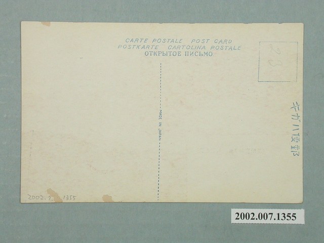 1.本物件為以新竹神社與爽吟閣為主題之明信片,正面有2張彩色圖像,右下照片為爽吟閣的彩色圖像,畫面中可見已爽吟閣右後方取景,鬱鬱山頭中一棟傳統型式建築鶴立雞群,上方有1段文字「新竹神社ト爽吟閣」,左上照片為新竹神社之彩色圖像,畫面中可見神社立於高處,欲前往參拜須步上階梯,下方有1段文字「(故北白川宮殿下御泊所)」;背面為空白明信片橫式書寫面,以藍色單色印刷,右上為郵票黏貼處,右側有「郵便ハガキ」字樣,上方有「CAPTE POSTALE POST CARD」及2行字樣,由上至下為「POSTKARTE CARTOLINA POSTALE」、「OTKPbITOE IIИCbMO」,中央有「MADE IN JAPAN」字樣。2.新竹神社建於北白川宮能久親王來臺時,於新竹市南方約5公里處之御遺跡處,於西元1918年12月舉行鎮座式,並於1920年列為縣社,為國幣小社。爽吟閣原為竹塹地區名人林占梅其庭園「潛園」內之建築,1895年北白川宮能久親王至新竹地區平定抵抗勢力的期間曾居住於此,後於1918年時,由潛園內拆除,搬遷至新竹神社內重建。