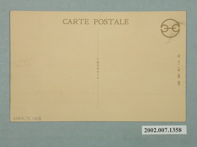 1.本物件為以臺中神社為主題之明信片,正面為臺中神社黑白照片,畫面中可見神社正面遠景,前方有1鳥居,照片左側有1臺黑色汽車,右上有1段文字「(臺中)臺中神社」;背面為空白明信片直式書寫面,以黑色單色印刷,左上為一特殊圓圈圖案,上方有「郵便はかき」字樣,左側有「CARTE POSTALE」字樣,中央有「臺中市役所發行」字樣。2.神社於臺灣的興建,與殖民政府想透徹的進行皇民化運動有關。臺灣第一座神社為西元1897年建的開山神社,其目的為藉由鄭成功其母為日本人此點,作為統治臺灣的合理根據,而臺灣地區神社暴增的時間點為1936至1940年期間,即是配合皇民化運動之進行。臺中神社建於1912年,2年後成為縣社,1940年時花費80萬圓於今日孔廟、忠烈祠附近建立新社殿,1942年成為國幣小社。