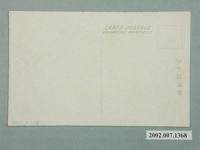 1.本物件為以臺南神社為主題之明信片,正面為臺南神社神苑黑白照片,畫面中可見神社之神苑廣闊,且有進行規劃,草木生長井然有序,下方有1段文字「官幣中社臺南神社神苑」,上方有1花朵樣式紅色戳印,有「官幣中社臺南神社參拜記念」字樣;背面為空白明信片直式書寫面,以黑色單色印刷,左上為郵票黏貼處,上方有「郵便はがき」字樣,左側上方有「CARTE POSTALE」與「UNIONPOSTALE UNIVERSELLE」2行字樣。2.神社於臺灣的興建,與殖民政府想透徹進行皇民化運動有關。臺灣第一座神社為西元1897年建的開山神社,其目的為藉由鄭成功其母為日本人,作為統治臺灣的合理根據,而臺灣地區神社暴增於1936至1940年間,即是配合皇民化運動之進行。臺南神社曾為北白川宮能久親王臺南御遺跡所,即1895年親王南下平定亂事時於臺南居住之所,本為當地豪族吳汝祥宅邸,親王過世後,將其使用過之房間、器物進行保存,1901年竣工。後於1920年起建神社,社殿以阿里山之檜木建造,主要祭祀北白川宮能久親王,1923年竣工,1925年被列為官幣中社,現已拆除,原址現為忠義國小及臺南市美術館二館。