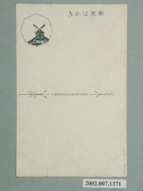 1.本物件為以臺南神社為主題之明信片,正面為2張黑白照片,右上照片為臺南神社御鎮座時之廠景,畫面中可見神社前方僅隔1鳥居,即連接道路,下方有1段文字「御鎮座當時ノ境內」,左下照片為臺南神社之現景,畫面中可見有前方有一段石燈籠參道,接著才為鳥居,進入後才為本殿,下方有1段文字「現在ノ境內」,左上有1花朵樣式紅色戳印,有「官幣中社臺南神社參拜記念」字樣;背面為空白明信片直式書寫面,以黑色單色印刷,左上有1特殊圖案,上方有「郵便はかき」字樣,中央有「官幣中社臺南神社社務所發行」字樣。2.神社於臺灣的興建,與殖民政府想透徹進行皇民化運動有關。臺灣第一座神社為西元1897年建的開山神社,其目的為藉由鄭成功其母為日本人,作為統治臺灣的合理根據,而臺灣地區神社暴增於1936至1940年間,即是配合皇民化運動之進行。臺南神社曾為北白川宮能久親王臺南御遺跡所,即1895年親王南下平定亂事時於臺南居住之所,本為當地豪族吳汝祥宅邸,親王過世後,將其使用過之房間、器物進行保存,1901年竣工。後於1920年起建神社,社殿以阿里山之檜木建造,主要祭祀北白川宮能久親王,1923年竣工,1925年被列為官幣中社,現已拆除,原址現為忠義國小及臺南市美術館二館。