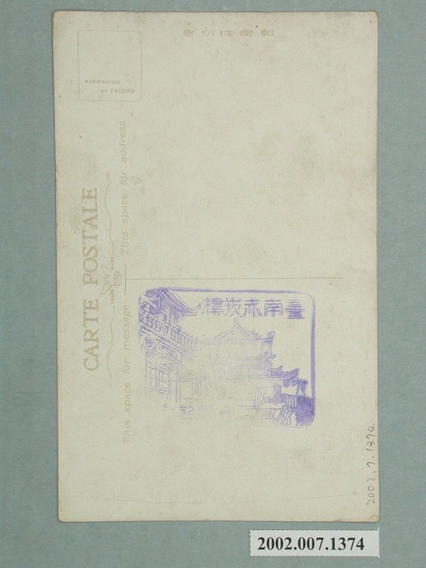 1.本物件為以臺南神社為主題之明信片,正面為臺南神社黑白照片,畫面中可見神社正面景,前方有1鳥居,進入鳥居後先經一段石燈籠參道後即抵達第2座鳥居,接著即為神社正殿,右上有1段文字「(臺南名所)臺南神社」;其背面為空白明信片直式書寫面,以黑色單色印刷,左上有郵票黏貼處,有1段文字「MANUFACTURE BY TAISHO」,上方有「郵便はかき」字樣,左側有「CARTE POSTALE」字樣與商標圖案,該圖案有「TRADE MARK」字樣,另有上下分別為「This space for address」、「This space for message」字樣,下方有1藍色正方形戳印,內有赤崁樓圖案及「臺南赤崁樓」字樣。2.神社於臺灣的興建,與殖民政府想透徹進行皇民化運動有關。臺灣第一座神社為西元1897年建的開山神社,其目的為藉由鄭成功其母為日本人,作為統治臺灣的合理根據,而臺灣地區神社暴增於1936至1940年間,即是配合皇民化運動之進行。臺南神社曾為北白川宮能久親王臺南御遺跡所,即1895年親王南下平定亂事時於臺南居住之所,本為當地豪族吳汝祥宅邸,親王過世後,將其使用過之房間、器物進行保存,1901年竣工。後於1920年起建神社,社殿以阿里山之檜木建造,主要祭祀北白川宮能久親王,1923年竣工,1925年被列為官幣中社,現已拆除,原址現為忠義國小及臺南市美術館二館。