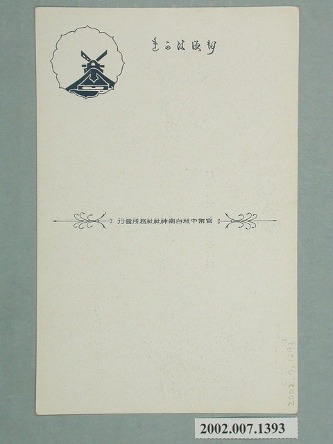 1.本物件為以臺南神社本殿、皇太子及大妃所植下之榕樹為主題之明信片,正面為3張黑白照片,右下照片為太子植的榕樹,畫面中可見該樹被柵欄圍住,下方有1段文字「大正十二年四月十二日皇太子殿下御手植榕」,中上照片為臺南神社本殿,畫面中可見本殿之一隅,下方有1段文字「官幣中社臺南神社本殿」,左下照片為大妃所植的榕樹,畫面中可見其仍為棵小樹,下方有段文字「大正十五年十月三十日北白川宮大妃殿下御手植榕」,下方有1花朵樣式紅色戳印,有「官幣中社臺南神社參拜記念」字樣;背面為空白明信片直式書寫面,以黑色單色印刷,左上有1特殊圖案,上方有「郵便はかき」字樣,中央有「官幣中社臺南神社社務所發行」字樣。2.神社於臺灣的興建,與殖民政府想透徹進行皇民化運動有關。臺灣第一座神社為西元1897年建的開山神社,其目的為藉由鄭成功其母為日本人,作為統治臺灣的合理根據,而臺灣地區神社暴增於1936至1940年間,即是配合皇民化運動之進行。臺南神社曾為北白川宮能久親王臺南御遺跡所,即1895年親王南下平定亂事時於臺南居住之所,本為當地豪族吳汝祥宅邸,親王過世後,將其使用過之房間、器物進行保存,1901年竣工。後於1920年起建神社,社殿以阿里山之檜木建造,主要祭祀北白川宮能久親王,1923年竣工,1925年被列為官幣中社,現已拆除,原址現為忠義國小及臺南市美術館二館。3.西元1923年4月時,裕仁皇太子曾於神社中門東側植種1棵榕樹,而1926年北白川宮大妃亦曾到神社及御遺跡所參訪,也植下1棵榕樹。