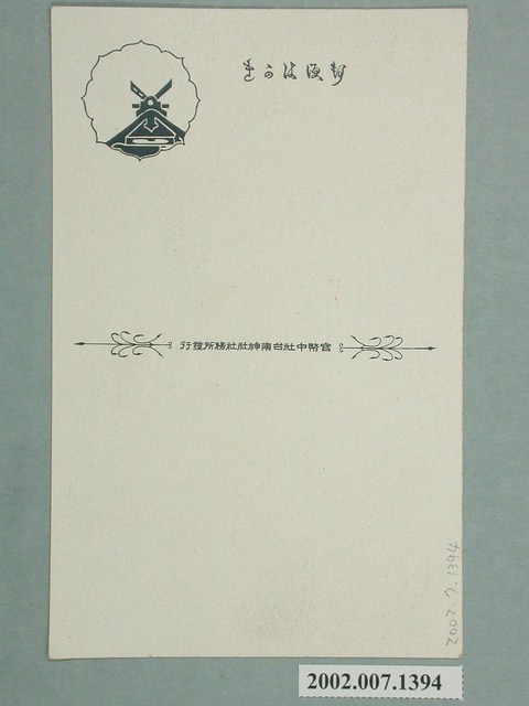 1.本物件為以臺南神社本殿、皇太子及大妃所植下之榕樹為主題之明信片,正面為3張黑白照片,右下照片為太子植的榕樹,畫面中可見該樹被柵欄圍住,下方有1段文字「大正十二年四月十二日皇太子殿下御手植榕」,中上照片為臺南神社本殿,畫面中可見本殿之一隅,下方有1段文字「官幣中社臺南神社本殿」,左下照片為大妃所植的榕樹,畫面中可見其仍為棵小樹,下方有段文字「大正十五年十月三十日北白川宮大妃殿下御手植榕」,下方有1花朵樣式紅色戳印,有「官幣中社臺南神社參拜記念」字樣;背面為空白明信片直式書寫面,以黑色單色印刷,左上有1特殊圖案,上方有「郵便はかき」字樣,中央有「官幣中社臺南神社社務所發行」字樣。2.神社於臺灣的興建,與殖民政府想透徹進行皇民化運動有關。臺灣第一座神社為西元1897年建的開山神社,其目的為藉由鄭成功其母為日本人,作為統治臺灣的合理根據,而臺灣地區神社暴增於1936至1940年間,即是配合皇民化運動之進行。臺南神社曾為北白川宮能久親王臺南御遺跡所,即1895年親王南下平定亂事時於臺南居住之所,本為當地豪族吳汝祥宅邸,親王過世後,將其使用過之房間、器物進行保存,1901年竣工。後於1920年起建神社,社殿以阿里山之檜木建造,主要祭祀北白川宮能久親王,1923年竣工,1925年被列為官幣中社,現已拆除,原址現為忠義國小及臺南市美術館二館。