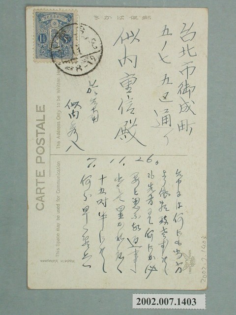 1.本物件為以開山神社為主題之明信片,正面為神社內部正殿黑白照片,畫面中可見正殿之正面景,氣氛莊嚴而肅然,右下有2段文字,第1段「(臺南名勝)開山神社」,第2段「KAISAN-SHRINE, TAINAN.」,左下有1段文字「明朝の遺臣、鄭成功を祀る。支那明朝の將に倒れんどするに當り此地に來り尚孤忠回復を圖らんどするも三十九才に逝けり、生母は肥前國平戶の藩醫田川氏也。」大意為祭祀明朝遺臣鄭成功,明朝被滅後仍至臺灣望能反清復明,然39歲即早逝,其母親為肥錢國平戶的田川氏;背面為空白明信片直式書寫面,以黑色單色印刷,左上貼有郵票並蓋有1郵戳,郵票為面值1錢5厘,上方有「郵便はかき」字樣,右下有一鳥樣式圖案,有「TRADE MARK」字樣,左下有「Made in Wakayama」字樣,左側有「CARTE POSTALE」及2行字樣,由上至下為「The Address Only to be Written Here」、「This Space may be used for Communication」,背面部分皆有字跡,上半部為地址,可辨識出「臺北市御成町五ノ七五邊通」、「似內□信殿」、「似內秀八」字樣,為收件人之地址,下半部有「7.11.26」為撰件日期,其餘為信件內容。2.神社於臺灣的興建,與殖民政府想透徹的進行皇民化運動有關。臺灣地區神社暴增於西元1936至1940年間,即是配合皇民化運動之進行。開山神社位於今臺南市中西區,清領時期為開臺聖王廟;1875年沈葆楨奏請朝廷改稱其為延平郡王廟(又稱延平郡王祠),主奉鄭成功;1897年日本殖民政府欲利用鄭成功之母為日本人田川氏此點,供奉鄭成功及其母親,以彰顯日本於臺灣統治的正當性,故將此改為開山神社,列為縣社。目前中央正殿設有鄭成功塑像與神位,左為甘輝將軍、右為張禮將軍,後殿祭祀其生母田川氏,左殿為監王祠祀有鄭克塽,右殿則為寧靖祠,祀有寧靖王及其五妃。