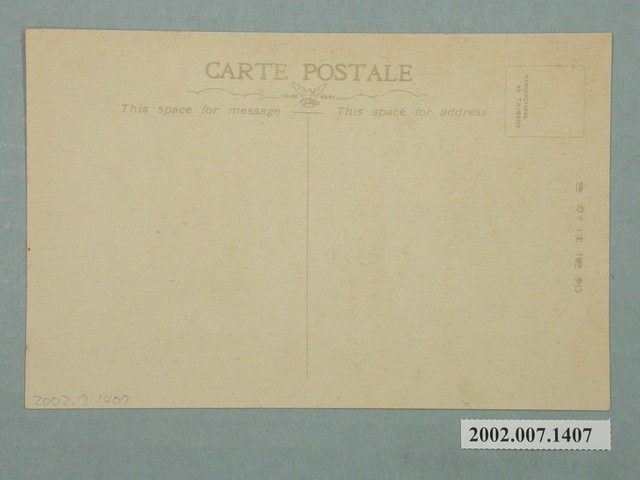 1.本物件為以開山神社為主題之明信片,正面為神社內部黑白照片,畫面中可見正殿之側景,亦可見兩側拜殿,正殿前有1亭,置有賽錢箱,氣氛莊嚴而肅然,左下有2段文字,第1段「KAISAN SHRINE DEIFIED MING PATRIOT, TAINAN」,第2段「(臺南名勝)明末の忠臣鄭成功を祀る開山神社」;背面為空白明信片直式書寫面,以黑色單色印刷,左上有郵票黏貼處,內有1段文字「MANUFACTURE BY TAISHO」,上方有「郵便はかき」字樣,左側有「CARTE POSTALE」字樣與商標圖案,該圖案有「TRADE MARK」字樣,另有上下分別為「This space for address」、「This space for message」字樣。2.神社於臺灣的興建,與殖民政府想透徹的進行皇民化運動有關。臺灣地區神社暴增於西元1936至1940年間,即是配合皇民化運動之進行。開山神社位於今臺南市中西區,清領時期為開臺聖王廟;1875年沈葆楨奏請朝廷改稱其為延平郡王廟(又稱延平郡王祠),主奉鄭成功;1897年日本殖民政府欲利用鄭成功之母為日本人田川氏此點,供奉鄭成功及其母親,以彰顯日本於臺灣統治的正當性,故將此改為開山神社,列為縣社。目前中央正殿設有鄭成功塑像與神位,左為甘輝將軍、右為張禮將軍,後殿祭祀其生母田川氏,左殿為監王祠祀有鄭克塽,右殿則為寧靖祠,祀有寧靖王及其五妃。