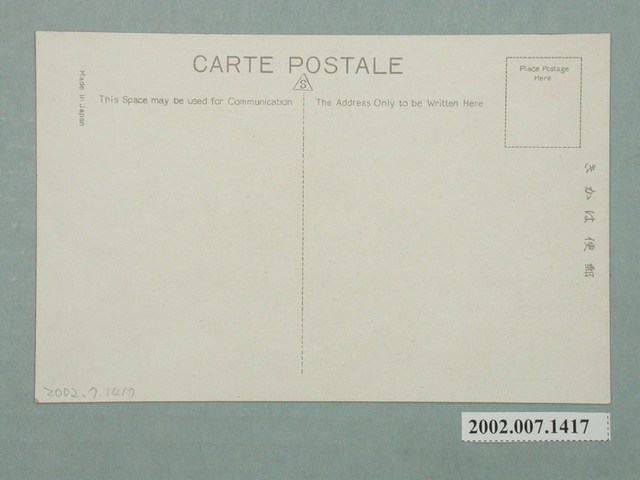 1.本物件為以高雄神社為主題之明信片,正面為高雄神社黑白照片,畫面中可見神社參道兩旁皆為石燈籠,前方登上階梯,穿越鳥居,即抵達神社正殿,右下有1段文字「昭和十四年 一月十四日地帶模第三号 高雄要塞司令部許可濟」,左下有1段文字「【臺灣高雄】...高雄神社」,左下有1鳳凰圖案;背面為空白明信片橫式書寫面,以黑色單色印刷,右上為郵票黏貼處,有「Place Postage Here」,右側有「郵便はかき」字樣,左下有「Made in Japan」字樣,上方有「CARTE POSTALE」及2行字樣,由左至右為「This Space may be used for Communication」、「The Address Only to be Written Here」。2.神社於臺灣的興建,於西元1936至1940年間最為盛行,與殖民政府想透徹的進行皇民化運動有關。 高雄神社其前身為1910年建立的打狗金刀比羅神社,1920年時配合神社新殿營造,加入祭祀北白川宮親王,改稱為高雄神社,並於1932年列為縣社。現址為高雄市忠烈祠。