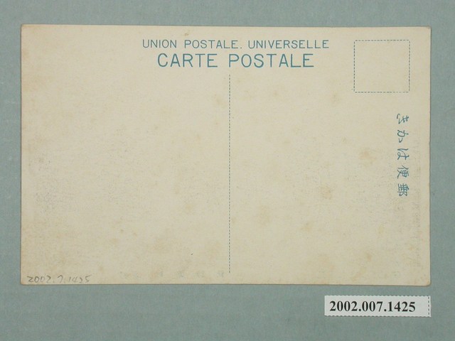 1.本物件為以阿緱神社為主題之明信片,正面為阿緱神社黑白照片,畫面中可見神社正面景,由神社外往正殿方向取景,前方鳥居旁兩側各有1座石燈籠,鳥居至正殿需經過1參道,右下有1段文字「屏東阿緱神社」,左下有1段文字「(屏東紀之國屋發行)」;其背面為空白明信片橫式書寫面,以藍色單色印刷,右上有郵票黏貼處,右側有「郵便はかき」字樣,上方有「UNION POSTALE UNIVERSELLE」、「CARTE POSTALE」2行字樣。2.神社於臺灣的興建,於西元1936至1940年間最為盛行,與殖民政府想透徹的進行皇民化運動有關。臺灣第一座神社為1897年建的開山神社,其目的為藉由鄭成功其母為日本人,作為統治臺灣的合理根據。阿緱神社建於1919年,內有祀奉北白川宮親王,1926年列為縣社,現為屏東縣立田徑場。