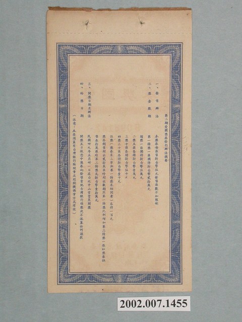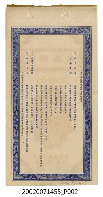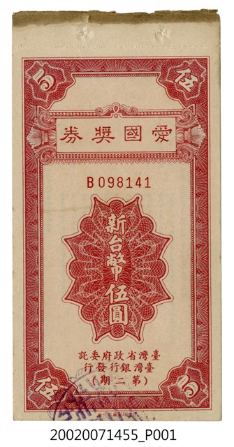 基本發行張數為二十萬張,自第2期開始,改為單聯式每張一號,且面額也自此改為伍圓,直式鈔券式設計,紅色網底紋邊框,由上而下分別為,刊頭「愛國獎券」四字以裝飾莨苕葉樣的長方形牌匾式樣由右至左排列,編號B098141,面額新台幣伍圓以幾何邊框飾網底紋樣,並以5和伍字樣裝飾幾何形框置於四角落,臺灣省政府委託臺灣銀行發行,(第二期),中央印製廠台北廠。
