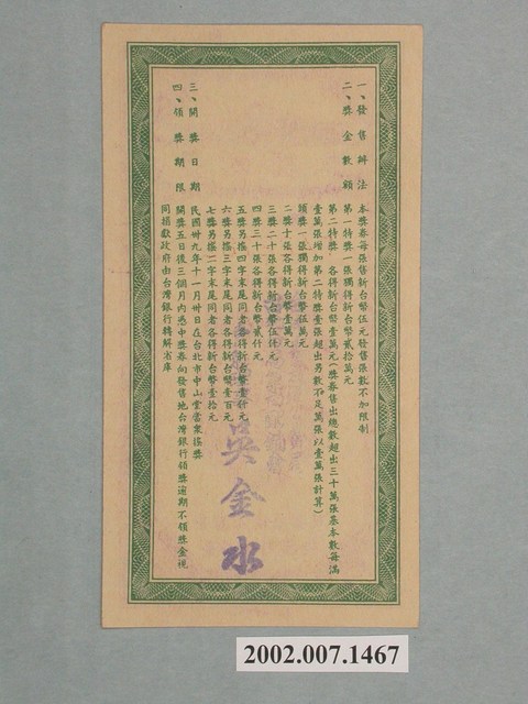 基本發行張數為三十萬張,自第14期起發行張數由20萬張增印至30萬張,直式鈔券式設計,紫色網底紋邊框,由上而下分別為,刊頭「愛國獎券」四字飾以莨苕葉牌匾式方框,(第十四期),編號P422782,面額新台幣伍圓以花形框飾網底紋樣,並以5和伍字飾三角網底紋樣置於四角落,臺灣省政府委託臺灣銀行發行,中央印製廠台北廠。