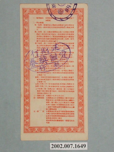基本發行張數為八十萬張,直式鈔券式設計,中央印製廠,橘色網底框,刊頭「第壹佰玖拾陸期」,「愛國獎券」四字白文置於框內,框飾莨苕葉等西洋紋飾,以台北小南門的圖案為軸心,「台北小南門」四字橫式置於圖右上方,面額新台幣伍圓,白紋置於框內,框飾連珠紋及卷葉紋,編號208492,編號下飾愛國獎券浮水印,「勵行節約」四個字,飾花框置於四角,臺灣省政府委託臺灣銀行發行,期數「196」以阿拉伯數字白文置於框下並置中,左右飾西洋紋飾。