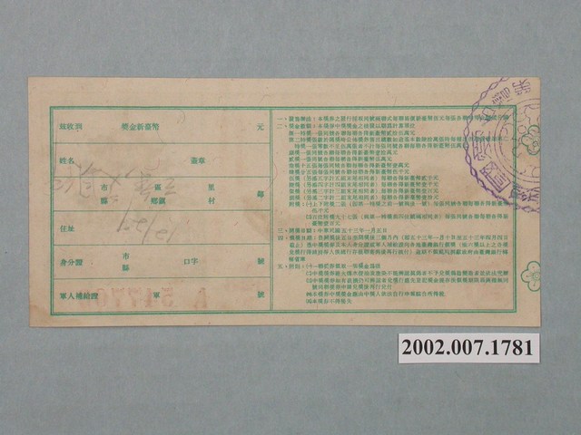 基本發行張數為六十萬張,橫式設計,由右至左,方形開光內「臺北新公園翠亨亭」圖,下列編號「A 547706」底飾愛國獎券浮水印,左「如意」圖樣,圖右「中華民國五十三年元月五日開獎」,下「不放鬆匪諜」,「第328期」,圖左「新年如意」,下「不冤枉好人」,圓框內「甲聯」,上橫列「愛國獎券」,下列「新臺幣伍圓」。