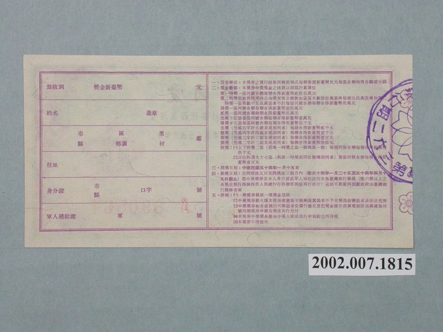 基本發行張數為六十萬張,橫式設計,左右飾莨苕葉紋,上列「愛國獎券」,「臺灣省政府委託臺灣銀行發行」,「中華民國五十四年一月十五日開獎」,「第362期」,圓框「甲聯」,右「新臺幣伍圓」底飾花形網紋,下編號「A690564」底飾愛國獎券浮水印,左「鵝鑾鼻燈塔」。