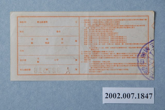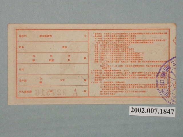 基本發行張數為六十萬張,橫式設計,左右飾卷葉紋,「雙鳥圖」,圖右上「中華民國五十四年十二月五日開獎」,圖右「第394期」,右下編號「A327516」底飾愛國獎券浮水印,左上列「愛國獎券」,圖左「新臺幣伍圓」下,左下「臺灣省政府委託臺灣銀行發行」,左下「甲聯」花框。