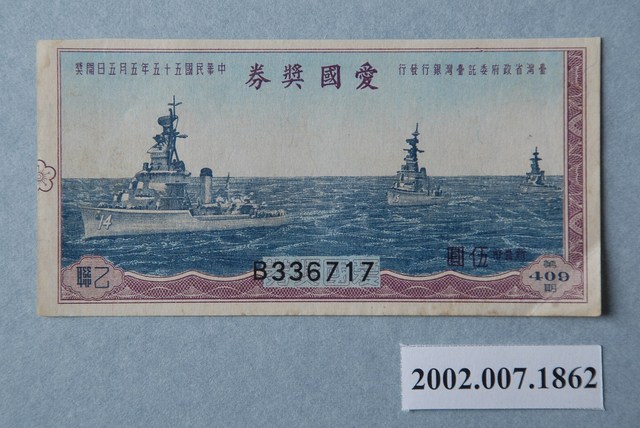 基本發行張數為六十萬張,橫式設計,「海軍軍艦圖」,由右至左上列「臺灣省政府委託臺灣銀行發行」,「愛國獎券」,「中華民國五十五年五月五日開獎」,下列「第409期」花框,「新臺幣伍圓」,編號「B336717」底飾愛國獎券浮水印,左「乙聯」左下角。