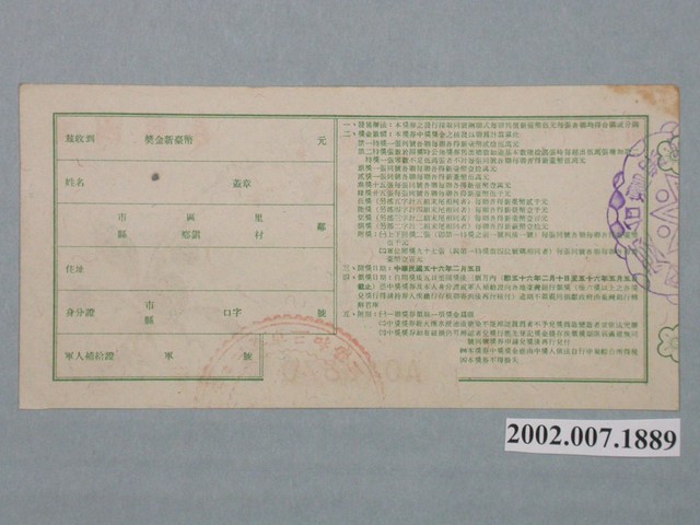 基本發行張數為六十萬張,橫式設計,由右至左,「臺灣省政府委託臺灣銀行發行」,上列「愛國獎券」,「蘭花」圖,根葉下「甲聯」,葉旁編號「A048570」,左上列「新臺幣伍圓」,中「第436期」,旁「中華民國五十六年二月五日開獎」。
